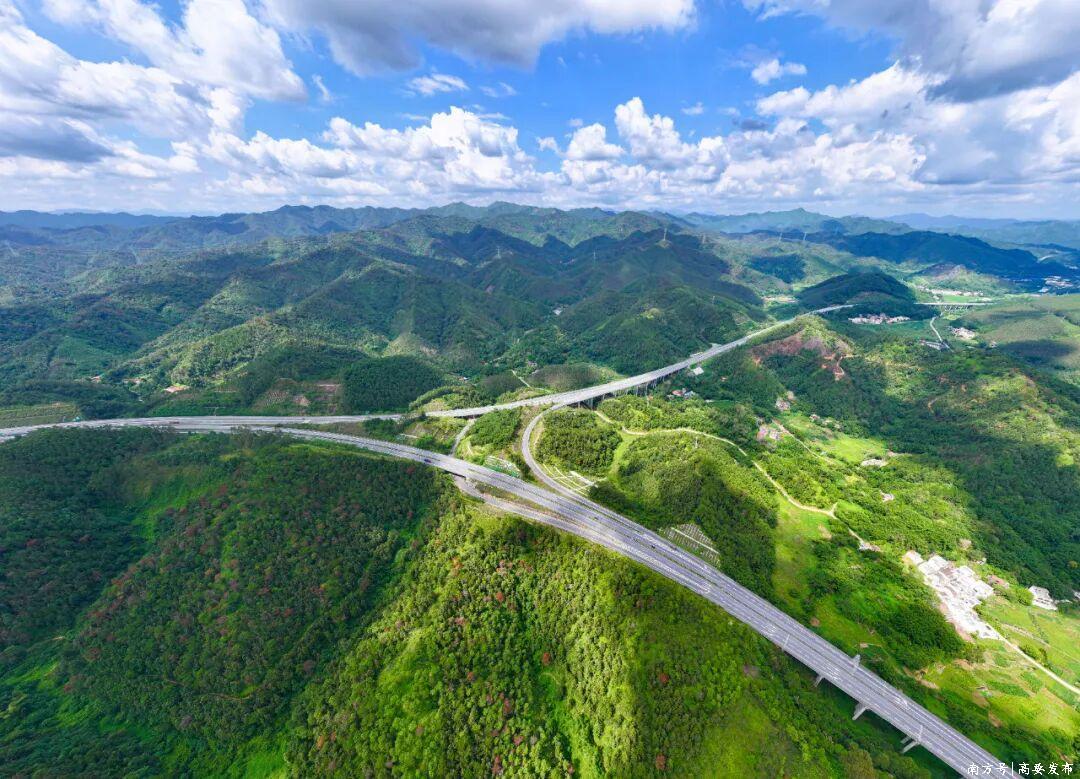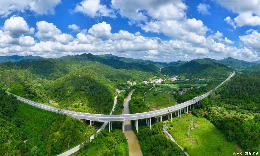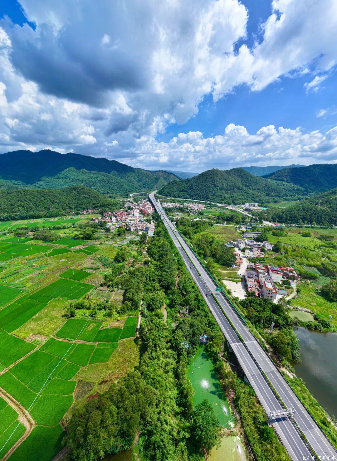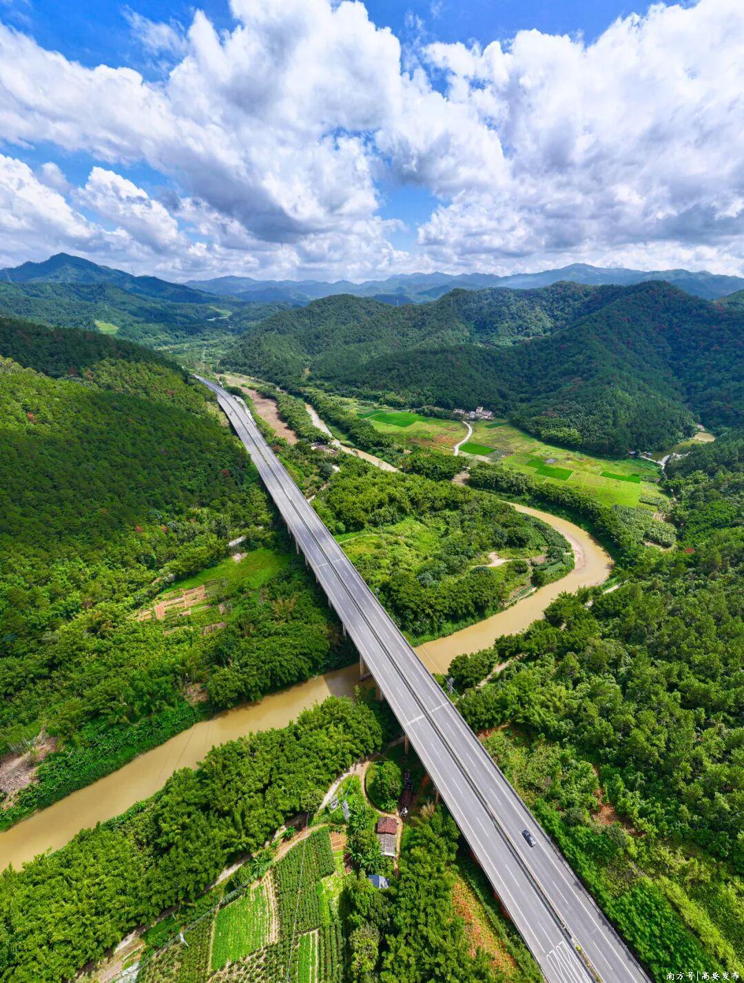 ▲ 汕湛高速公路跨越大迳河,在山间穿行。大迳河蜿蜒流淌,与郁郁葱葱的山林、错落的农田及散落的村落相映成趣。邓达荣 摄