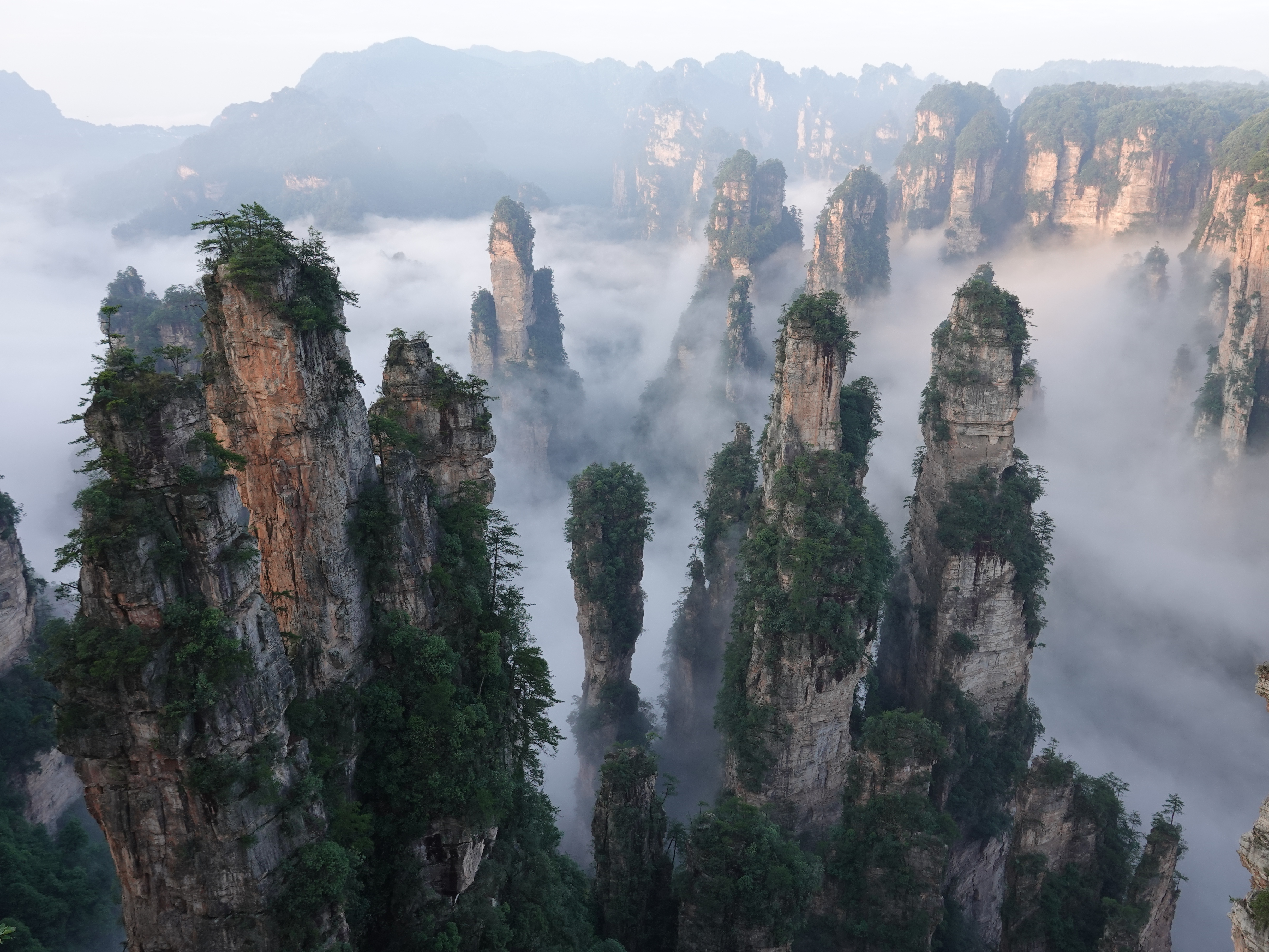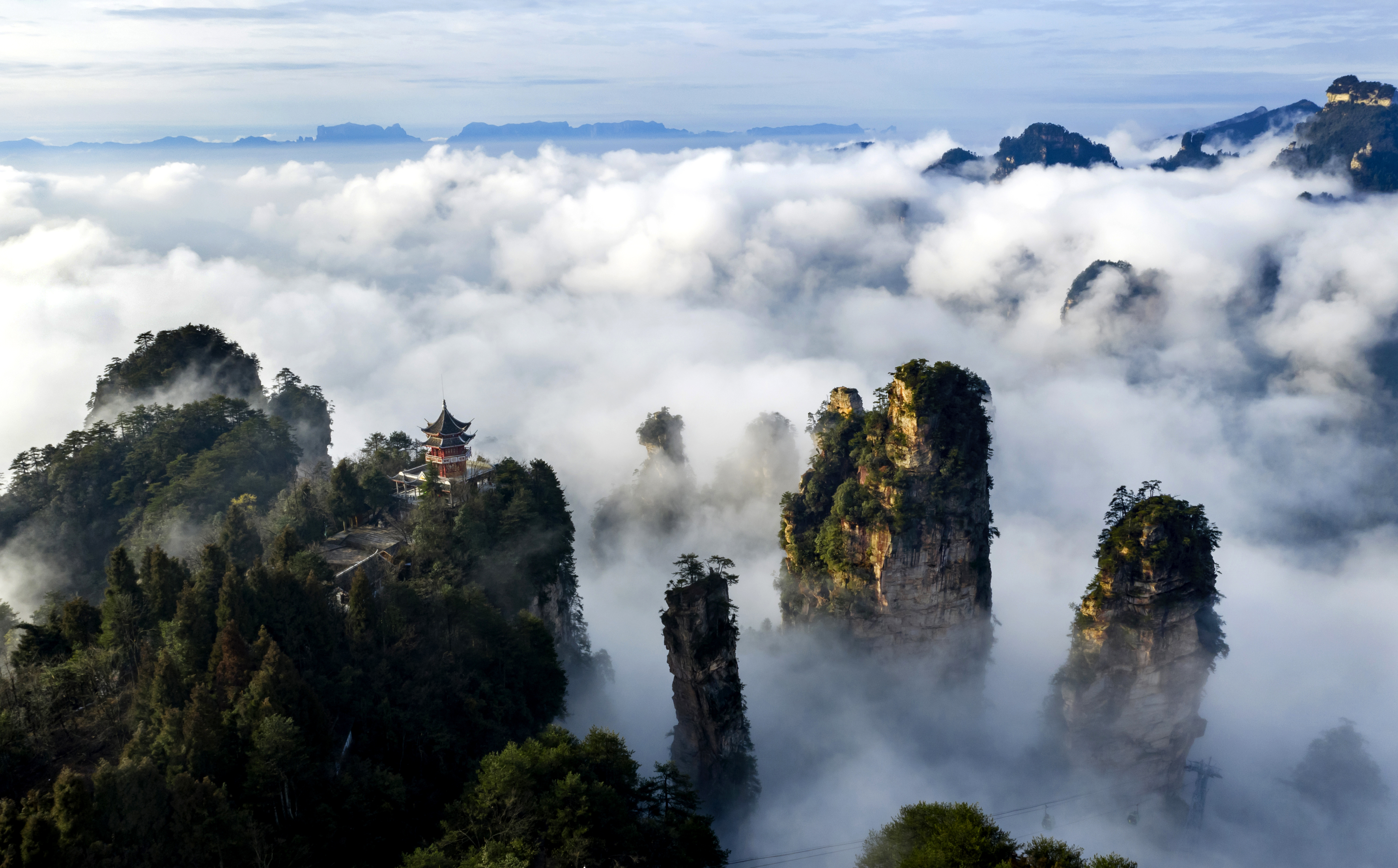下午可以去黄石寨或天子山。坐索道上山时,从缆车往下看,能看见神奇峰林在山上移动,越往上走越凉快。到了山顶,走在游道上,脚下是深谷,身旁是云雾,风一吹,热意全消。运气好,还能碰见小松鼠从路上窜过去。