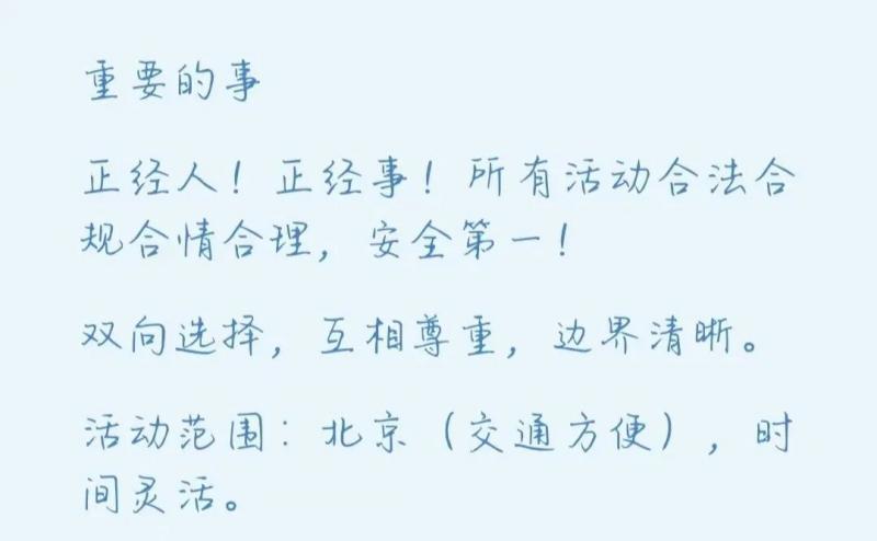排除风险,也是晴野的必修课。她在帖子里明确注明:“正经人、正经事,所以活动合法合规合情合理,安全第一”,同时强调“互相尊重,边界清晰”。即便如此,她依然遇到过带有不良目的的骚扰。