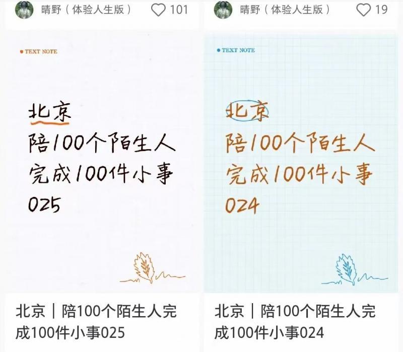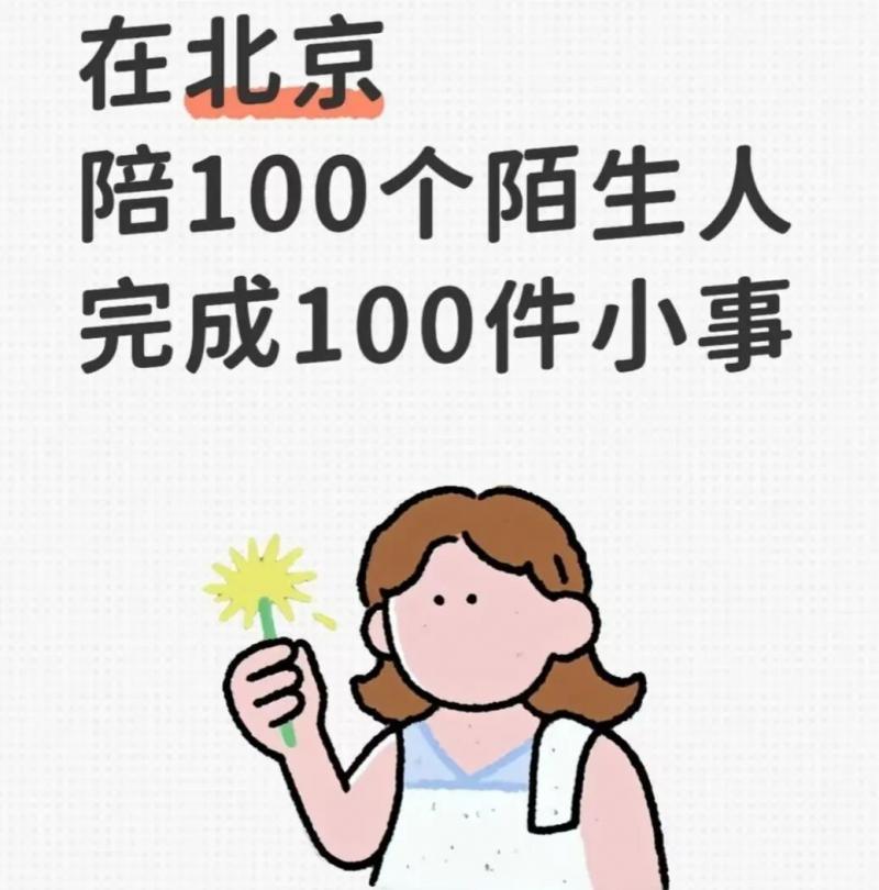 放假前的一天,晴野刷手机时,看到一则帖子——“陪100个陌生人做100件小事”。发帖网友在其中记录了与陌生人社交的点滴经历。这让晴野觉得,这是一个既新鲜又有意义的创意。于是,从今年6月初开始,她也发起了自己的尝试,并在社交平台上推出了名为“在北京,陪100个陌生人,完成100件小事”的帖子。